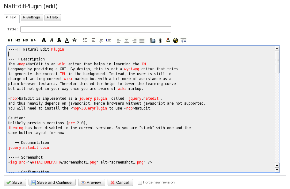 support for TinyMCEPlugin wysiwyg editor; removed non-maintained "word" style; fixes for foswiki/compat; added settings template; distinguishing restore revision from a normal edit; made DBCachePlugin's topic title feature optional; added "Show on screen" settings to easily switch off form, attachment or meta:comments (forthcoming); fixed action=text; removing TopicTitle formfield from the "Form" tab if it is already on the "Text" tab |